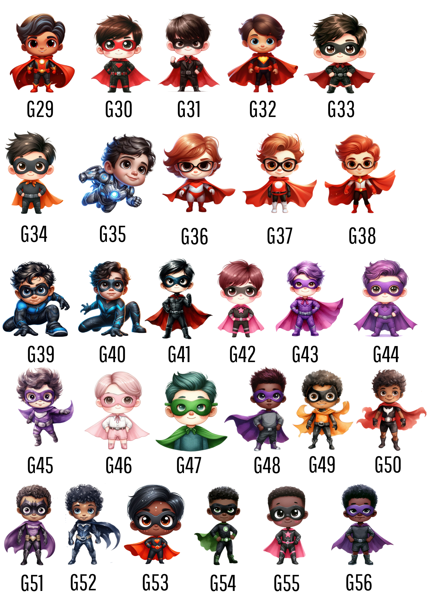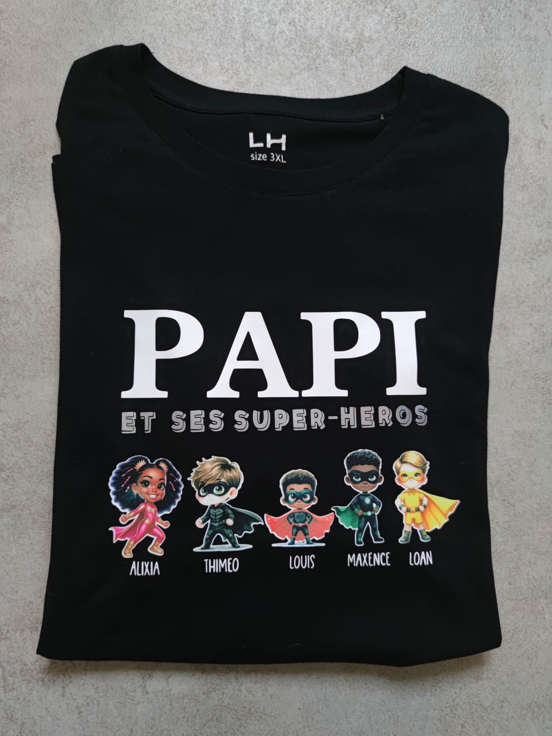 Merci de préciser les informations nécessaires à la personnalisation : prénoms, couleur des écritures, choix des personnages, texte (super papi, super papa, etc)