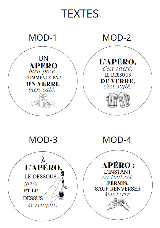 Merci de préciser le modèle souhaité ainsi que le fond. Si vous souhaitez un nouveau modèle, merci de préciser votre texte ainsi que le choix des polices d'écritures / fonds / pictogrammes.