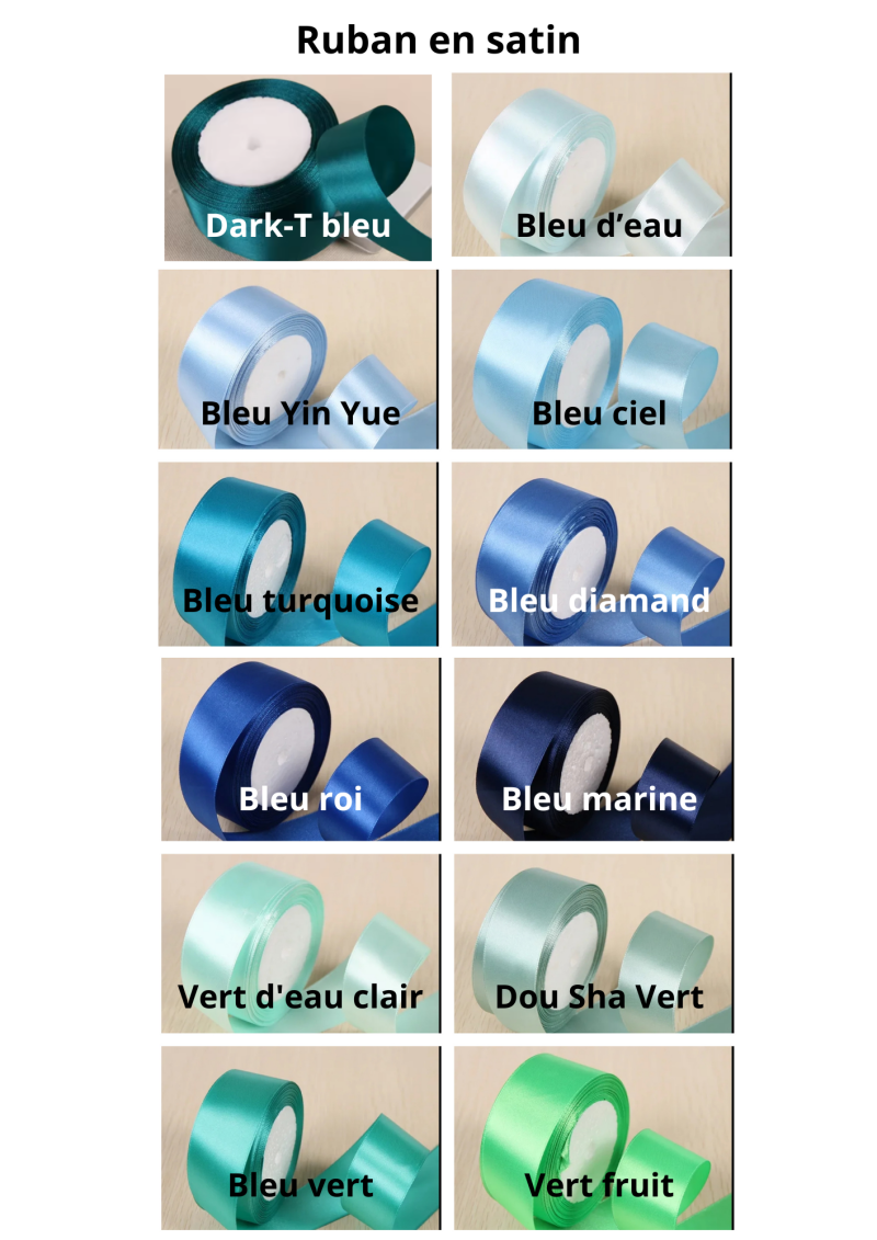 Merci de préciser : - les couleurs souhaitées (se référer à la liste, voir photos) - la texture de chaque ruban (satin, dentelle, organza)